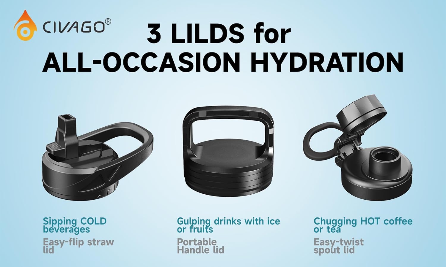 INSULATED WATER BOTTLE: Featuring advanced vacuum insulation technology, CIVAGO 32 oz water bottle keeps your drink HOT for 12 hours and COLD for up to 24 hours, allowing you to enjoy icy cold drinks after intense workouts or hot coffee while winter camping