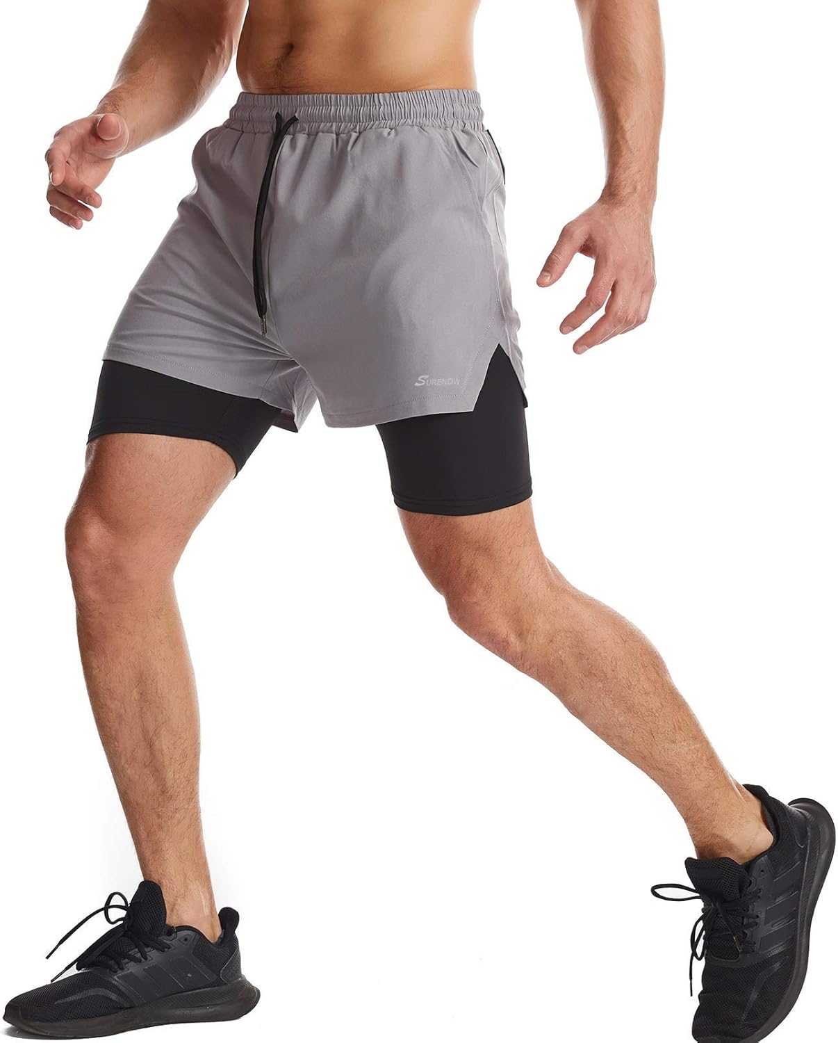 Surenow Mens 2 in 1 Running Shorts Quick Dry Athletic Shorts with Liner, Workout Shorts with Zip Pockets and Towel Loop