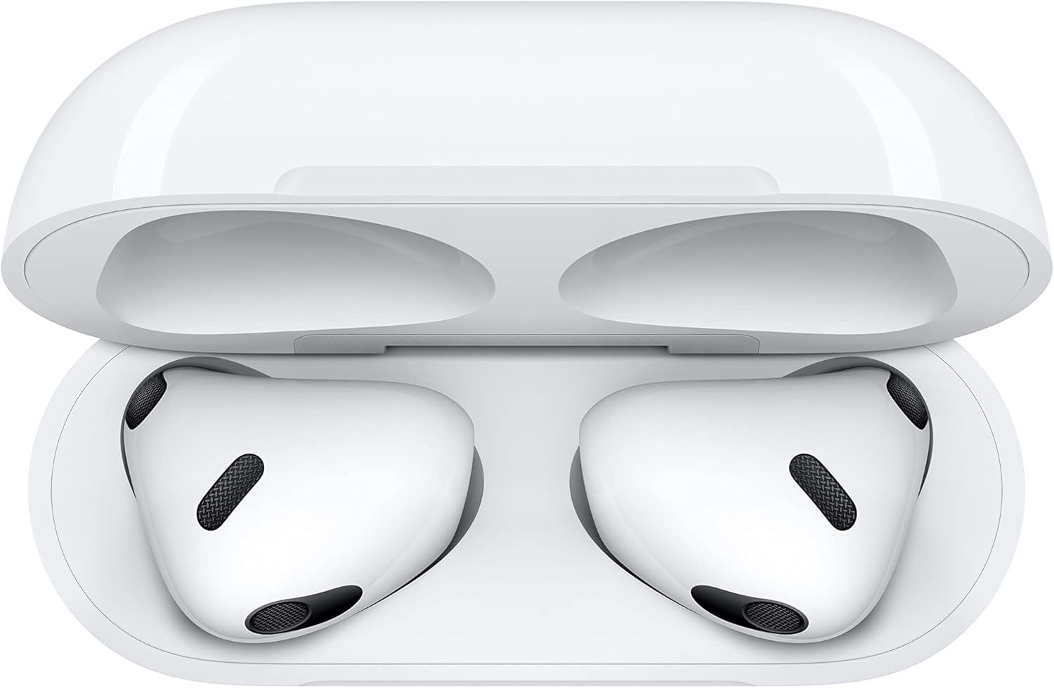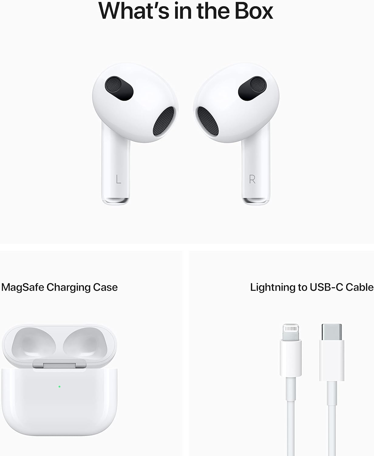 AirPods (3rd generation) offer immersive Personalized Spatial Audio and extended battery life. Sweat and water-resistant, they deliver a seamless experience. The Force sensor lets you control entertainment and calls, and they include a Magsafe Charging Case with up to 6 hours of total listening time. Quick access to Siri is available with “Hey Siri,” and setup is easy with in-ear detection and automatic device switching. You can share audio between two sets of AirPods and locate them using Find My with proximity view. Compatible with iPhone 8 or later, iPod touch (7th gen), and various iPad models running the latest software.