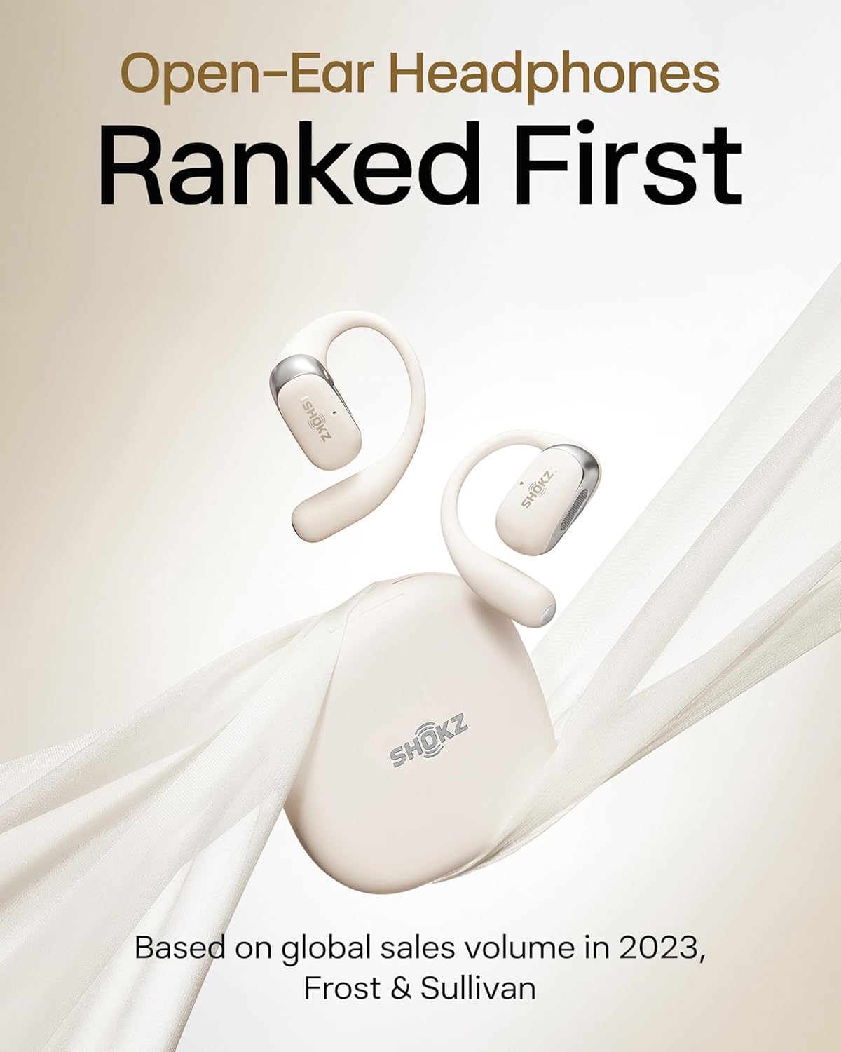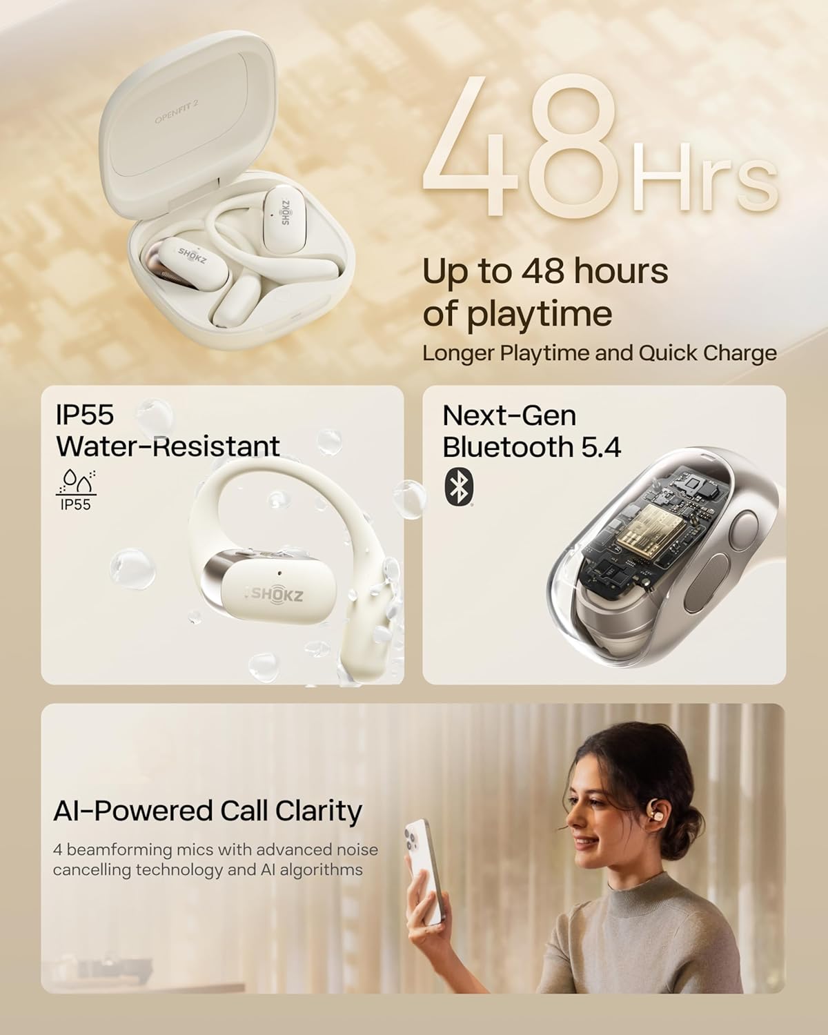 SHOKZ New OpenFit 2 Open-Ear Headphones, True Wireless Bluetooth Earphones with Microphone, Earhook Earbuds with 48 Hours of Playtime, Fast Charging, IP55 Water-Resistant, with Carrying Bag, Beige
