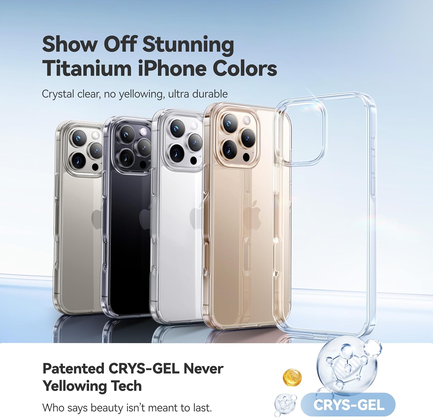 【Perfect Color Show & Never Yellow】This transparent iPhone 16 ProMax case can show the Titanium color and design of your new phone more clearly. We use the premium Bayer TPU imported from Germany and the latest AR-technology increases light transmittance to nearly 100%, making it super-clear and flawless. “Never Yellow” benefits from CASEKOO’s innovative CRYS-GEL anti-yellow Technology, which allows it to remain transparent for longer.