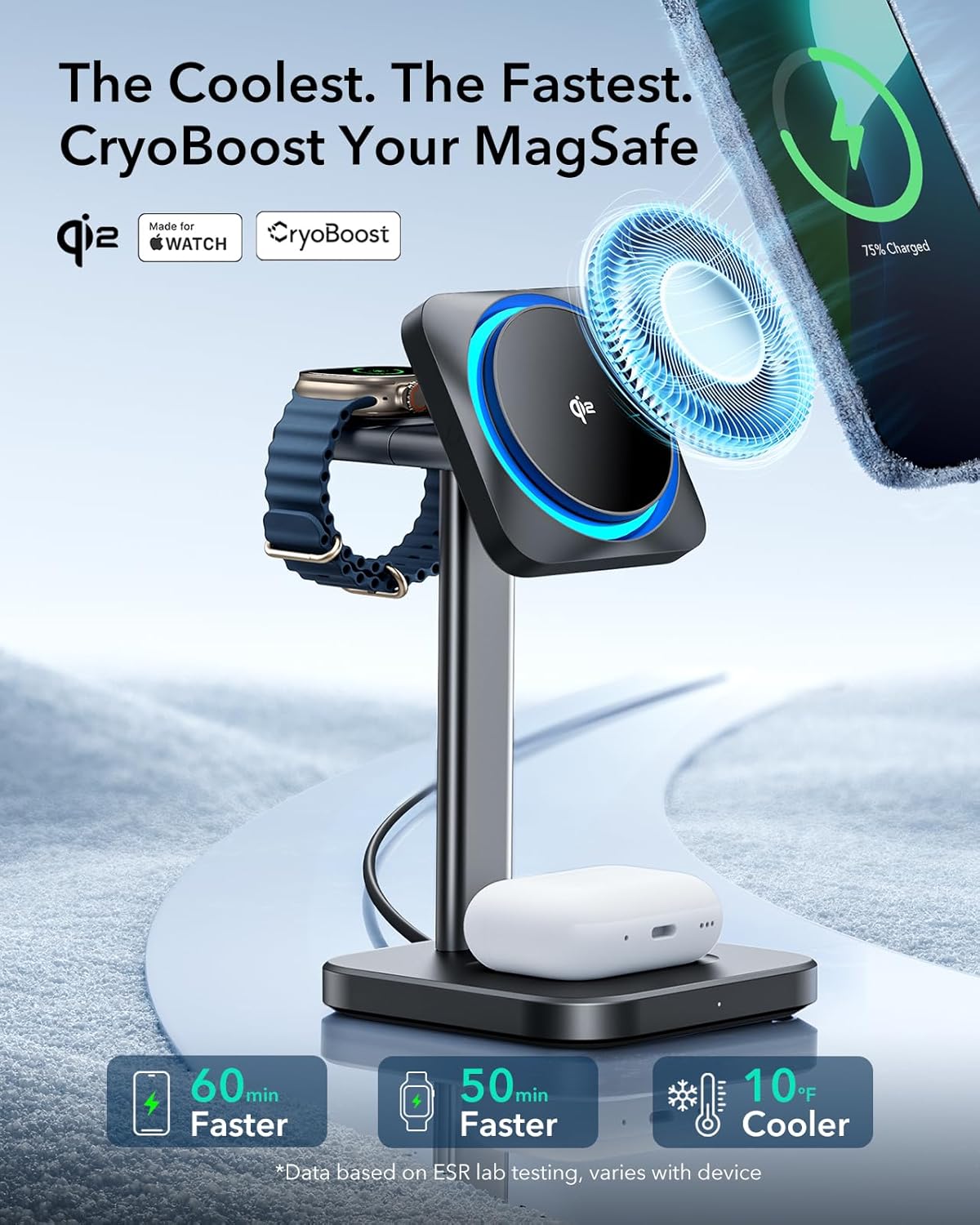 ESR Qi2 3 in 1 Wireless Charging Station with CryoBoost, [Certified] Phone-Cooling Wireless Charger & 15W Qi2 Charger Stand for iPhone16/15/14/13/12 Series, AirPods 4/3/Pro/Pro 2, Apple Watch, Black