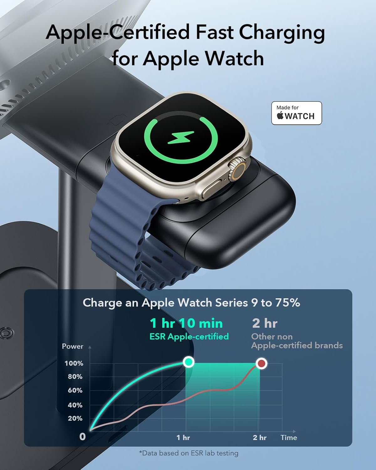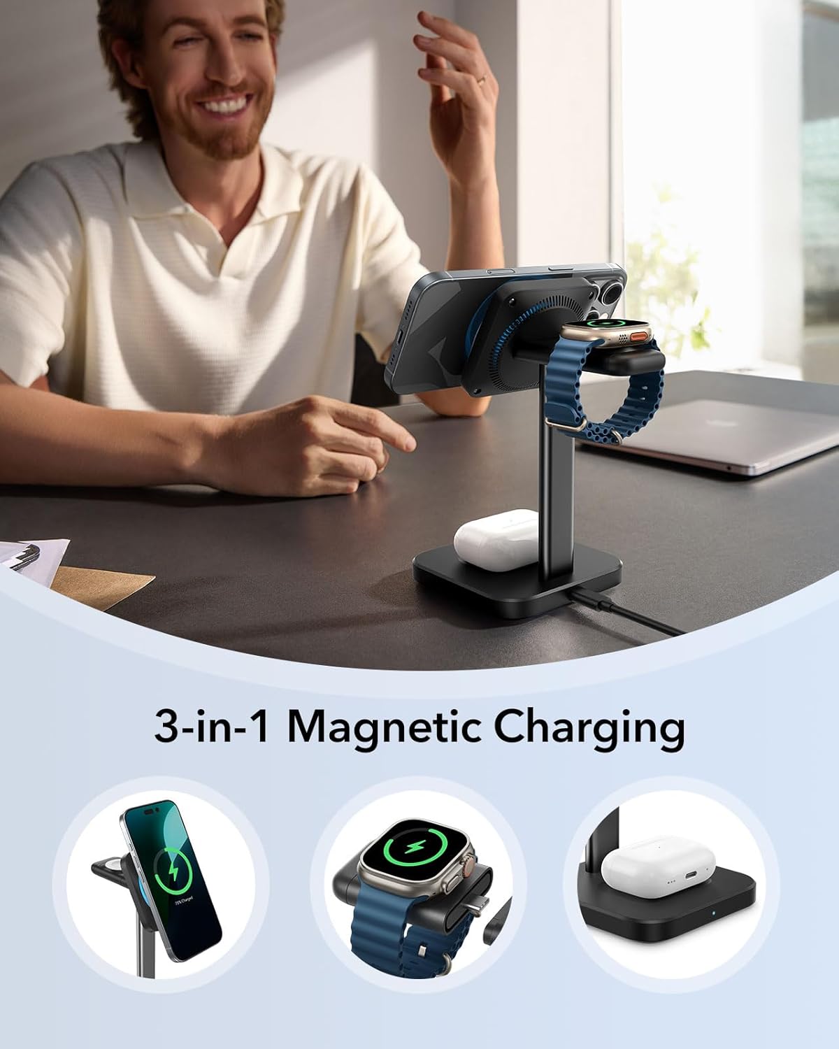 3-in-1 MagSafe Charger Stand: Power all 3 of your essential Apple devices simultaneously, declutter your desk or nightstand, and simplify your daily charging routine at home, the office, or while traveling; only compatible with iPhone 16/15/14/13/12 series, AirPods Pro/3/2, Apple Watch Ultra, Apple Watch Series 8/7/6/5/4/3/2/1, and Apple Watch SE 2/1